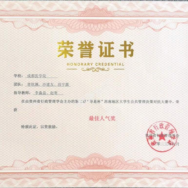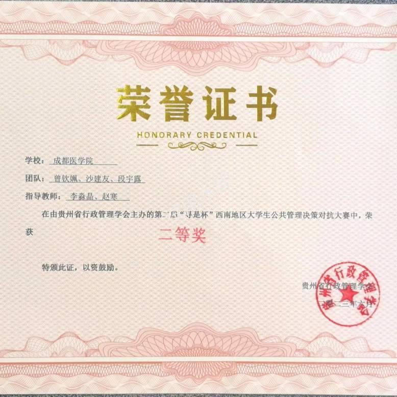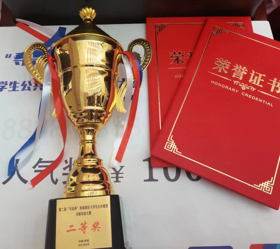 近日第二届“寻是杯”西南地区老员工公共管理决策对抗大赛在贵州贵阳顺利举行。在李淼晶、赵寒、段力三位老师的指导下,公司公共事业管理专业沙建友等三位同学组成的“星光大道梦”员工代表队荣获赛事“二等奖”、“单项最佳人气奖”;李淼晶教授、赵寒老师获优秀指导教师奖。这是该团队继2021年7月“哲寻杯”全国老员工公共管理决策对抗大赛西南赛区荣获三等奖后,再次在国赛中取得的新突破。